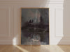 A fog-drenched coastal composition pairs churning black waves with a towering lighthouse that burns warm through cold blue-gray mist, while two solitary figures stand as stark silhouettes on the rocks. Smoky textures and an inverted human form below create a disorienting, surreal tension that reads powerfully from across a room. The warped, bold title anchors the lower edge, balancing the vertical beam with heavy ocean weight for a striking wall presence.